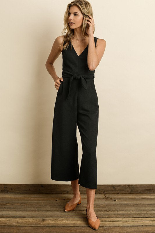 - Cropped jumpsuit featuring a plunging v-neckline, wrap-back/tie-front bodice, and a cutout detail at the back