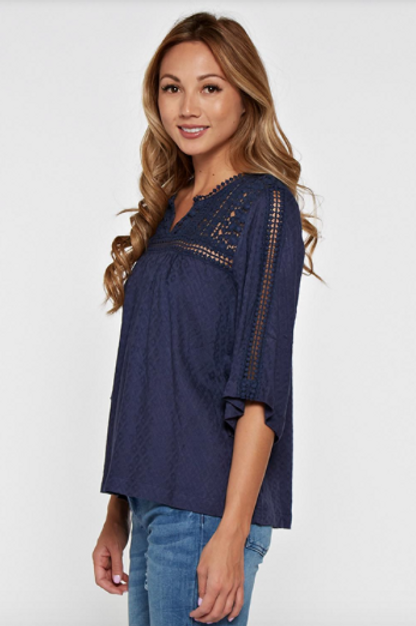 - 3/4 sleeve jacquard fabric top with mixed crochet trim throughout back and yoke front details