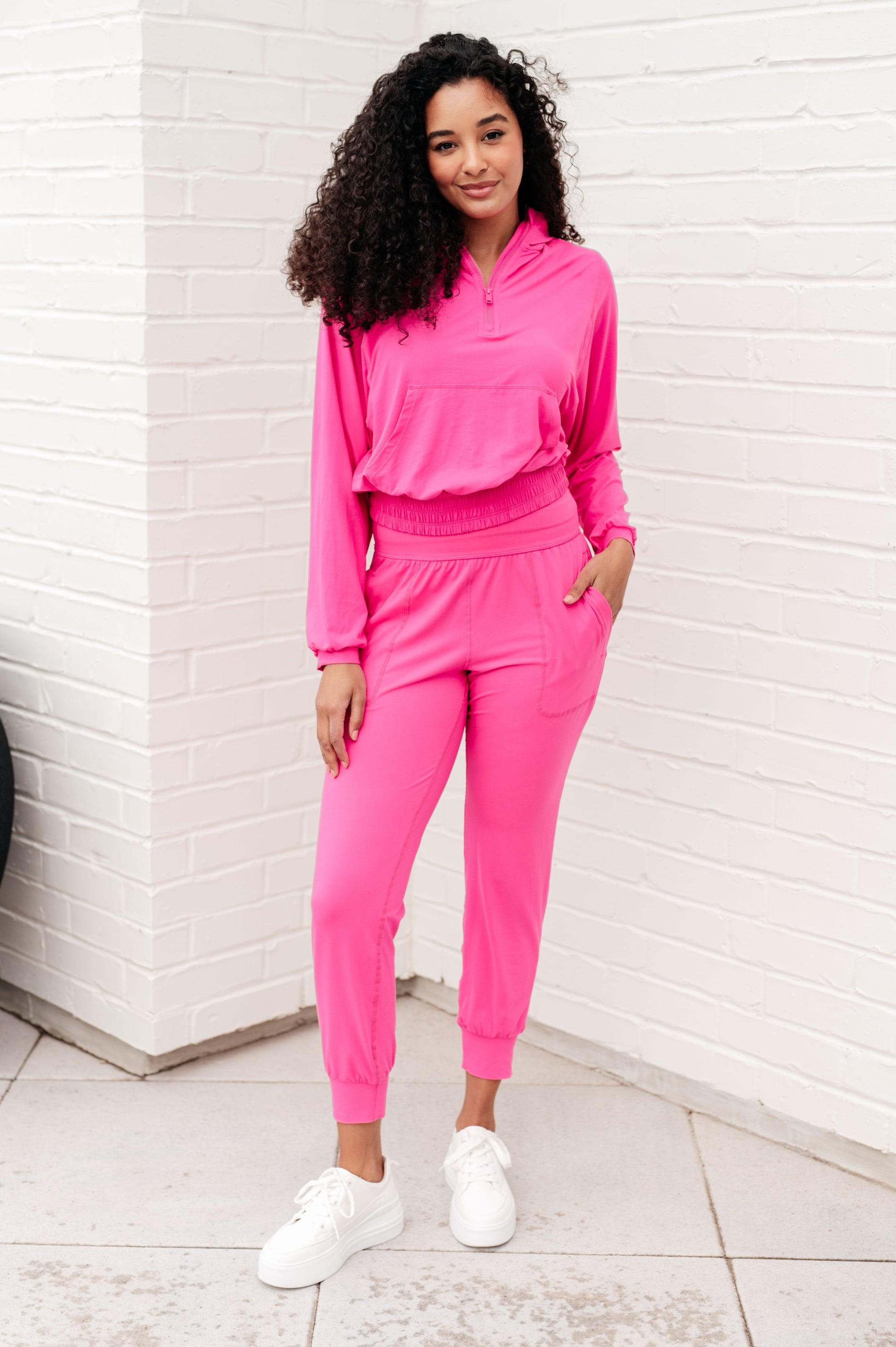 Invest in the perfect "running buddy" with our Morning Run Half Zip Hoodie in Sonic Pink. Made with brushed microfiber for a soft touch, this hoodie also features a half zip for ventilation and a smocked elastic waistline for a flattering fit. Complete with a hood and kangaroo pocket for added convenience, this hoodie is the perfect addition to your closet!